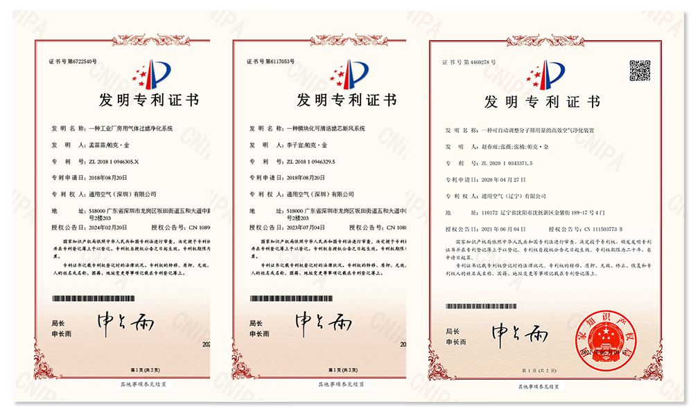 通用空气(深圳)有限公司主营气体净化技术、分离技术、制备技术、过滤技术、气相净化 媒体领域的产品开发、加工、销售、服务;主要致力于为IAQ、商业净化、工业净化、气体 制备、空气环境智能平台、智能物联等方面提供成套解决方案、相关产品和进口产品。目前 公司已申请5项发明专利,分别为: